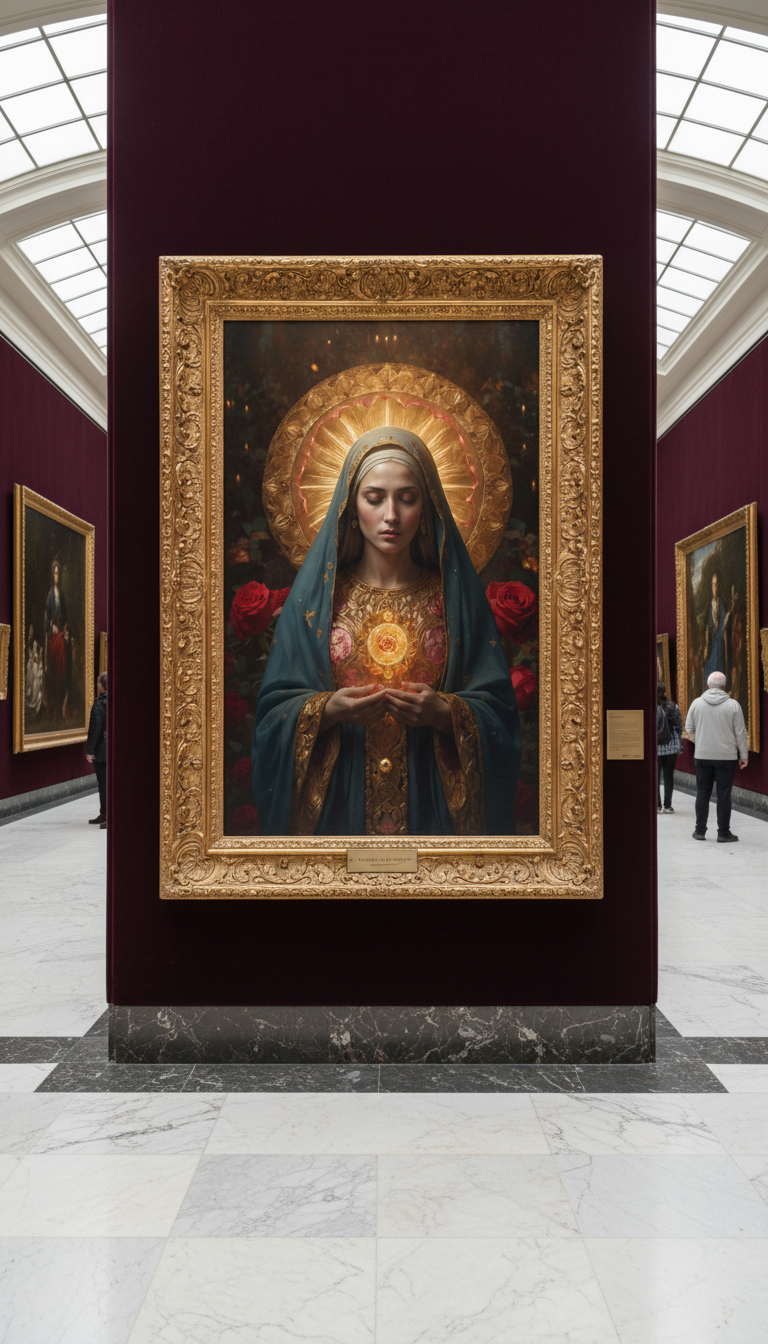 Die goldene Mystische Rose – Gold symbolisiert das Göttliche, die Rose das Herz der Heiligen Maria -, die wir in dieser ikonischen Marien-Darstellung von Raphael Stella sehen, ist eines der klassischen Symbole für die Essenz des Heiligen Grals.
